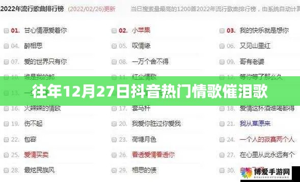随着互联网的普及和社交媒体的繁荣,抖音成为了许多音乐爱好者的聚集地,每年的12月27日,抖音上总会涌现出许多热门的情歌,其中不乏一些催泪之作,本文将带你回顾往年12月27日抖音上的热门情歌,感受那些触动心灵的旋律。