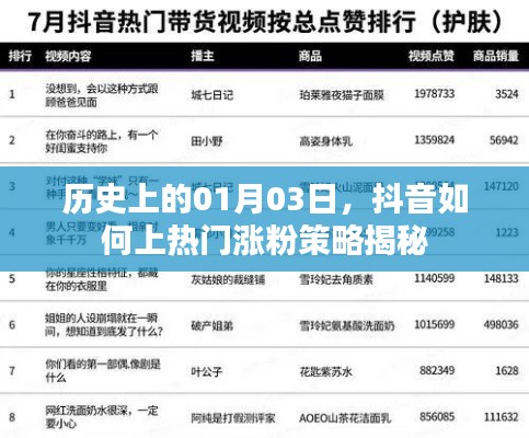 在数字化时代,社交媒体已成为人们生活中不可或缺的一部分,抖音作为当下最热门的短视频平台之一,吸引了众多创作者的关注,本文将围绕历史上的1月3日,探讨如何利用这一时间节点及常规策略,助力抖音账号上热门涨粉。